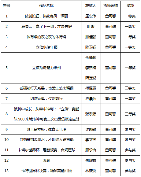 岁月缱绻,葳蕤生香,穿越时光的平仄,2022年上海市“阳光体育”大学生志愿者优培计划暨第二届上海市高校体育新闻大赛落下帷幕。我校体育与健康学院董可馨老师带队指导,19名学生经过理论培训、选题、采编、摄影及作品打磨,最终获奖13篇,取得优异的成绩。其中获得一等奖作品5个,三等奖作品3个,参与奖作品5个。