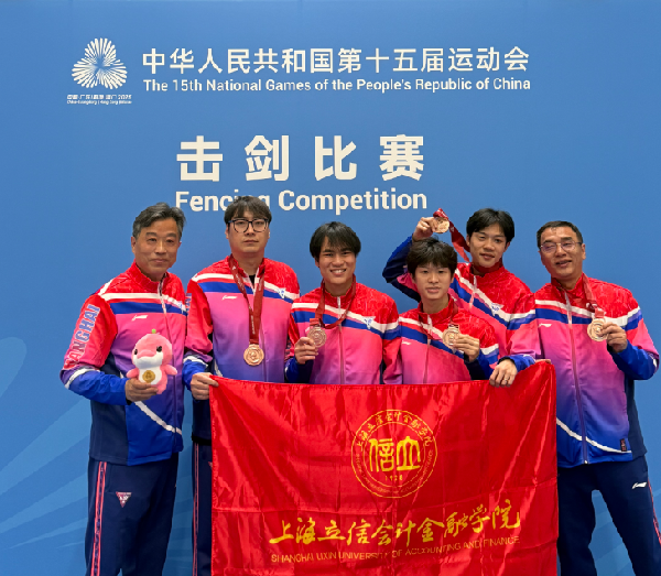 其中,我校健儿在本届全运会上为上海市代表团贡献了重要力量,共斩获1枚竞技体育项目铜牌及1枚群众体育项目金牌。校市花剑队队员陈奕宁、蔡金琿、仇辰杰与队友吴斌(来自虹口区体育局)协力夺得男子花剑团体季军;校女足高水平运动队队员邵丽娜、李永婷、高静、马慧君、沈鑫怡、李焱、舒佳怡入选女子五人制足球群众组上海队并随队夺冠。