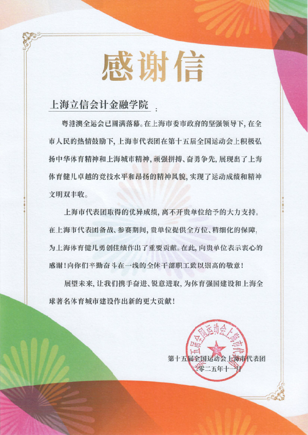 鉴于我校健儿的突出表现,校市花剑队队员仇辰杰、陈奕宁、蔡金琿及教练员胡承安荣获“上海市体育事业贡献奖”并记功,副领队张振宇获表彰嘉奖。上海市代表团还向我校发来感谢信,高度肯定并对我校为上海体育健儿勇创佳绩做出的重要贡献表示感谢。