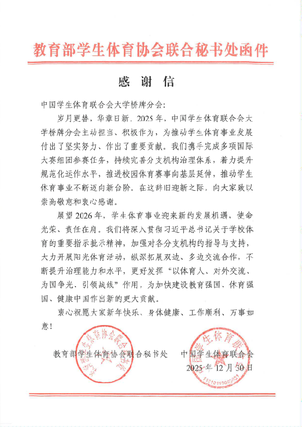 近日,教育部学生体育协会联合秘书处向我校作为主席单位的中国学生体育联合会大学桥牌分会发来感谢信,对分会2025年的工作给予高度肯定,并对2026年的发展寄予厚望。
