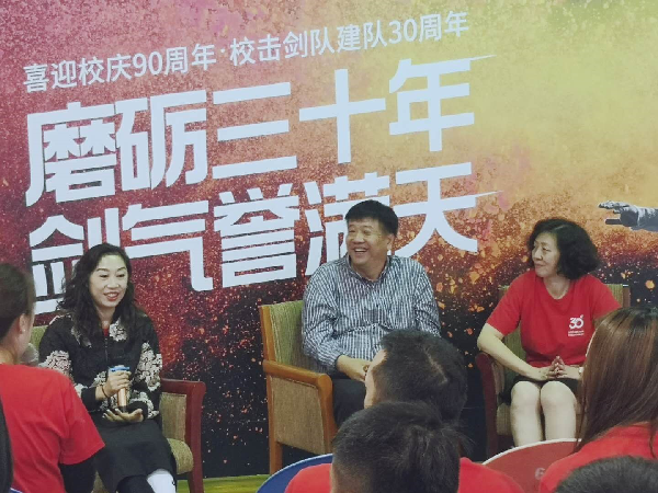 接着,第一届击剑队队长88级代表赵蕾、95级代表吴逸和06级代表张俊隆分别发言,重温击剑队从八十年初成立之初在艰苦环境下凭着对击剑队纯粹热爱,坚持到九十年代的锋芒毕露,直到千禧年代冲向世界的整个历程。所有队员都表达了对李兴林老师的感谢和感恩!