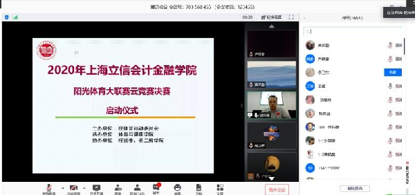 6月3日下午,由校体育运动委员会主办,体育与健康学院承办、校团委和各二级学院协办的上海立信会计金融学院2020年阳光体育大联赛云竞赛决赛启动仪式暨平板支撑项目决赛在腾讯会议平台进行。副校长、校体育运动委员会主任赵荣善出席活动并致词,会议由体育与健康学院党总支书记尹晓春主持,校体育运动委员会成员共17人出席本次活动。