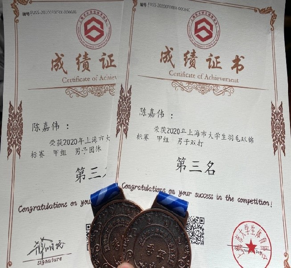 在来自上海高校的35个队伍中,我校羽毛球队一路过关斩将,突出重围,获得甲组男子团体第三名,女子团体第六名,单项男子双打第三名的好成绩。